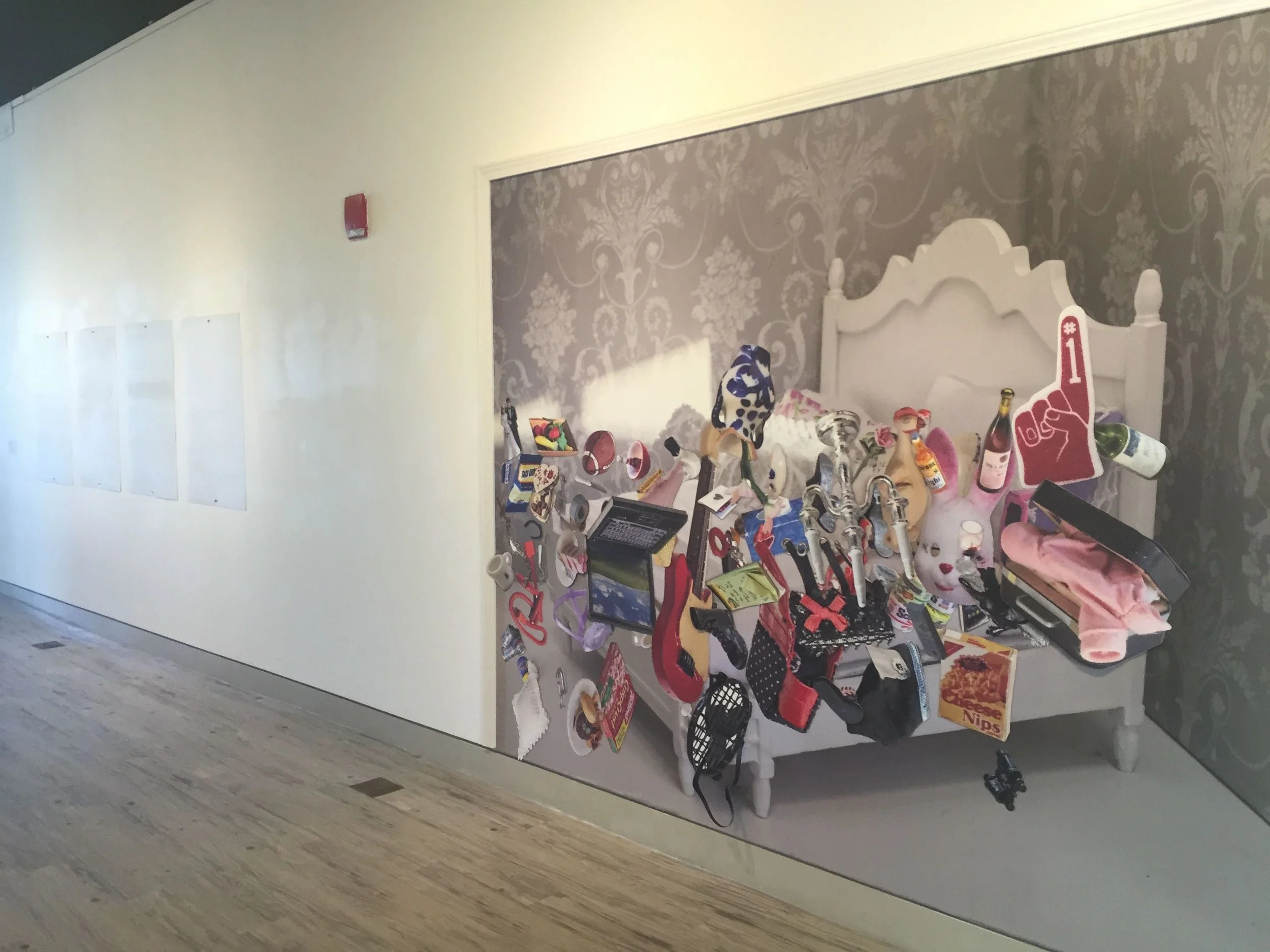 The exhibition Every Now and Then at the Arlington Arts Center on view April 18 to Jun2 28, 2015. Large-scale photographs of dollhouses reveal domestic scenes that are at once tantalizing and unsettling. Bridget Sue Lambert takes the dollhouse, a diminutive and nostalgic plaything, and enlarges and subverts its typical use. The gallery transformed into a room-sized construction and the audience enters into the ambiguous residue of past private moments.